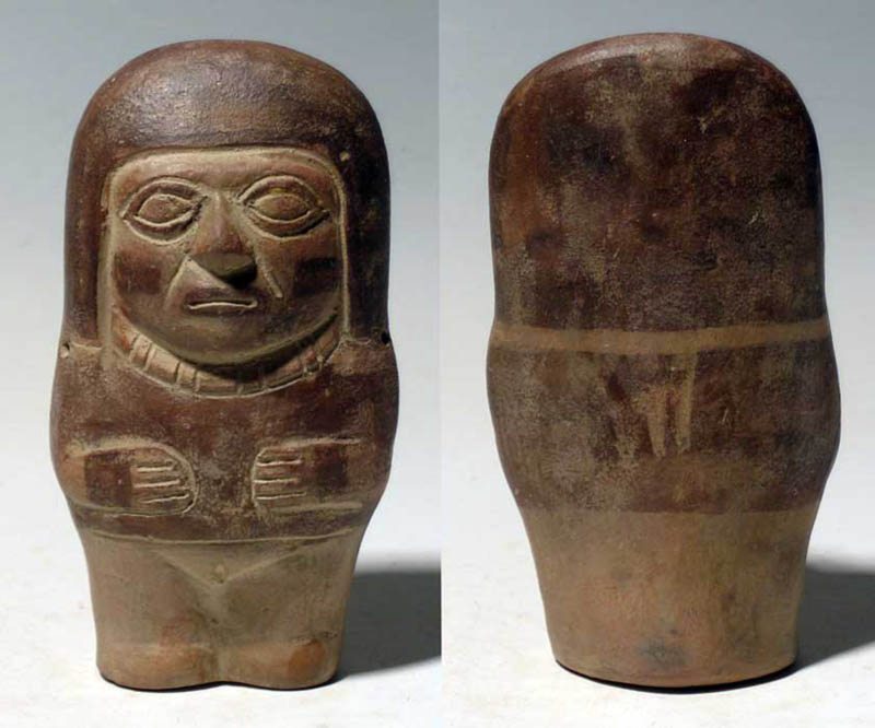 Moche Figure from Peru, ca. 400 - 700 AD. A lovely Moche figurine from Peru, ca. 400 - 700 AD. This standing female is 4-3/4" high and is beautifully detailed. The facial features are expressive, arms and tunic are molded in relief and she is adorned with a segmented necklace and facial d�cor. Intact, strong paint, good mineral deposits. Ex Pachenko collection. Value range: $300 - $400.