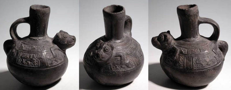 Chimu Viringo Bottle from Peru, ca. 1100 - 1450 AD. A choice Chimu blackware bottle from Peru, ca. 1100 - 1450 AD. This elaborately decorated vessel is 5-3/4" high and features a viringo draped over the top of the chamber. This adorable canine's face is beautifully detailed and expressive, with appendages molded in high relief. The chamber id decorated with panels depicting the Moon Dragon and a band of recurved step-fret designs. Ex Caravallo collection. Value range: $350 - $500.