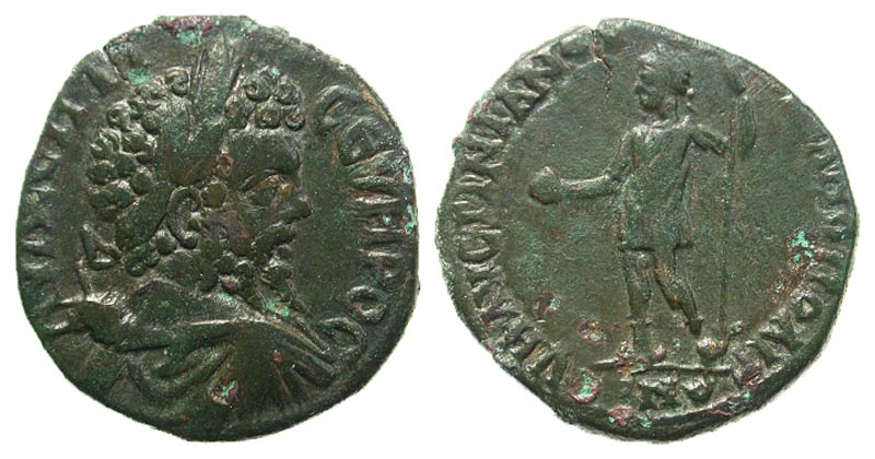 Moesia Inferior, Marcianopolis. Septimius Severus. A.D. 193-211. Æ tetrassarion (26.3 mm, 10.34 g, 2 h). A.D. 207-210. Julius Faustinianus, consular legate. AV Λ CEΠTI CEVHPOC, laureate, draped and cuirassed bust right / VI+ AVCTIANOV MAPKIANOΠOΛITΩN, emperor standing left, holding spear and globe. Varbanov 791; AMNG 575 var; H&J 6.14.34.3. aVF.