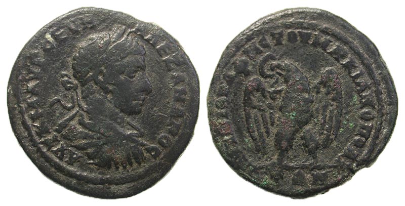 Moesia Inferior, Marcianopolis. Severus Alexander. A.D. 222-235. Æ tetrassarion (26.4 mm, 10.72 g, 7 h). A.D. 225-229. Tib. Julius Festus, consular legate. AVT K M AVP CEVH AΛEZANΔPOC, laureate, draped and cuirassed bust right / YΠ TIB IOVΛ ΦHCOTOV MAPKIANOΠOΠITΩN, eagle standing facing, wings spread, head left, with wreath in its beak. Varbanov 1771; AMNG 1018; H&J 6.32.1.6-7. Fine.