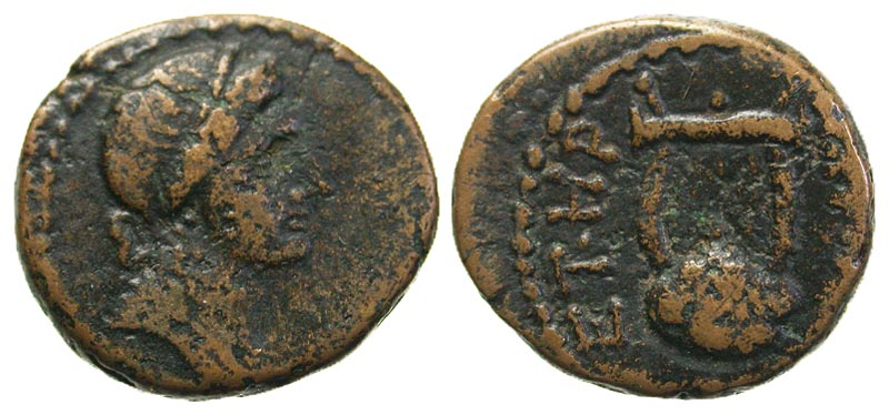 Syria, Seleucis and Pieria. Antiochia ad Orontem. Civic Issue. Time of Nero. AE dichalkon (16.5 mm, 3.12 g, 12 h). Dated 108 = A.D. 59/60. Laureate and draped bust of Apollo left / ANTIOXE ET HP, lyre. McAlee 107b; RPC 4293; BMC 80. VF.