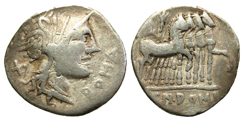 Cn. Domitius Ahenobarbus. 116-115 B.C. AR denarius (20.6 mm, 3.75 g, 10 h). Rome. ROMA, Helmeted head of Roma right; X behind / CN·DOMI, Jupiter driving triumphal quadriga right, holding laurel branch and thunderbolt. Crawford 285/1; Sydenham 535; RSC Domitia 7. Fine, Scarce.