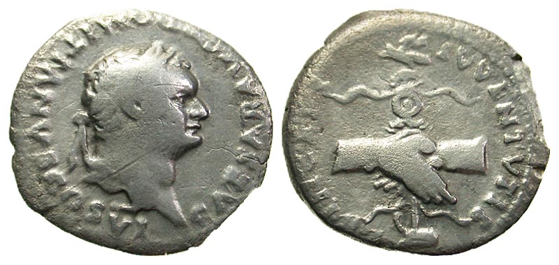Domitian. As Caesar, A.D. 69-81. AR denarius (18.1 mm, 2.37 g, 5 h). Rome, A.D. 79. CAESAR AVG F DOMITIANVS COS VI, laureate head right / PRINCEPS IVVENTVTIS, clasped hands holding legionary eagle set on prow. RIC 1081 (Vespasian); BMCRE 269 (Vespasian); RSC 393. Fine.