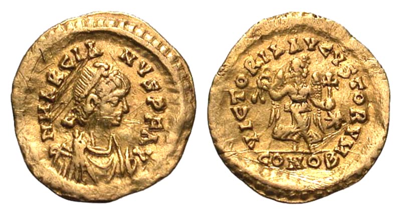 Marcian. A.D. 450-457. AV tremissis (15.2 mm, 1.46 g, 5 h). Constantinople mint. DN MARCIANVS P F AV, pearl-diademed, draped, and cuirassed bust right / VICTORIA AVGVSTORVM, Victory advancing right, head left, holding wreath and globus cruciger; star to right; CONOB in exergue. RIC 520. VF, scratches.