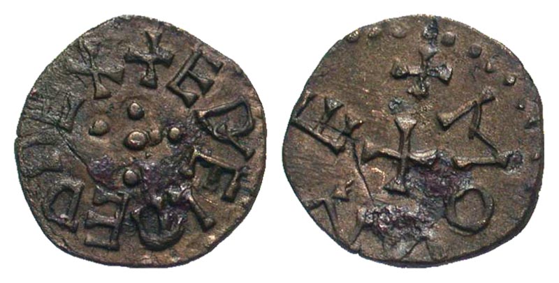 Anglo-Saxon, Kings of All England. Aethelred II. First reign, 841-843/4. Æ styca (13.3 mm, 1.16 g, 9 h). York mint, Struck 837-841. Monne, moneyer. +EDIELRED REX (sic), cross of five pellets / +MONNE (first N retrograde), cross. SCBC 865; North 188 var; Abramson 150 var/26d var. VF.