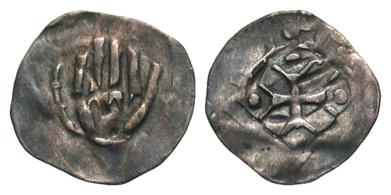 German States, Hall in Schwaben. City Coinage. 14th century AR heller (18.1 mm, 0.54 g, 12 h). Facing hand / Cross with pellets. Saurma 1364; Raff 18c. EF, toned.