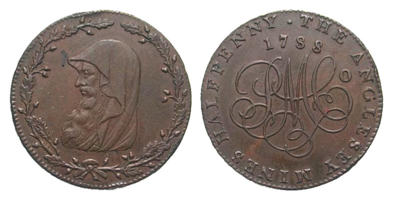 Great Britain, Wales. Anglesey. 1788. Æ half penny (29.4 mm, 14.07 g, 12 h). Bust of Druid within wreath left / Monogram. D&H 282. EF.