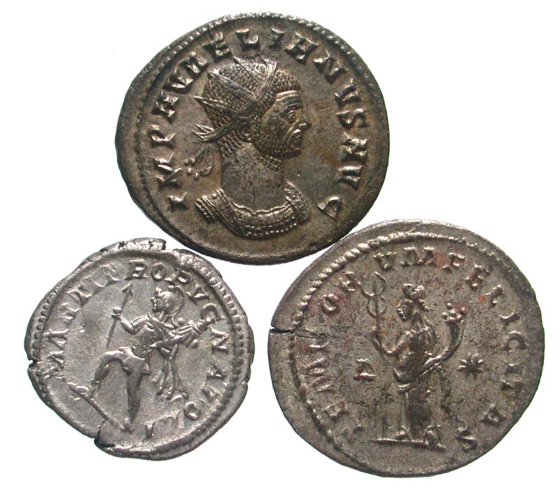 Lot of 3 Roman Silver Coins. Aurelian, Antoninianus, Victory // Tacitus, Antoninianus, Felicitas // Caracalla, Denarius, Mars. Average grade aVF and better.