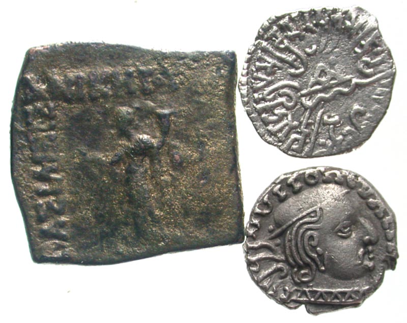 Lot of 3 Indian Coins. Bactria, Philoxenos square unit // 2 Guptas, drachms. F-VF.