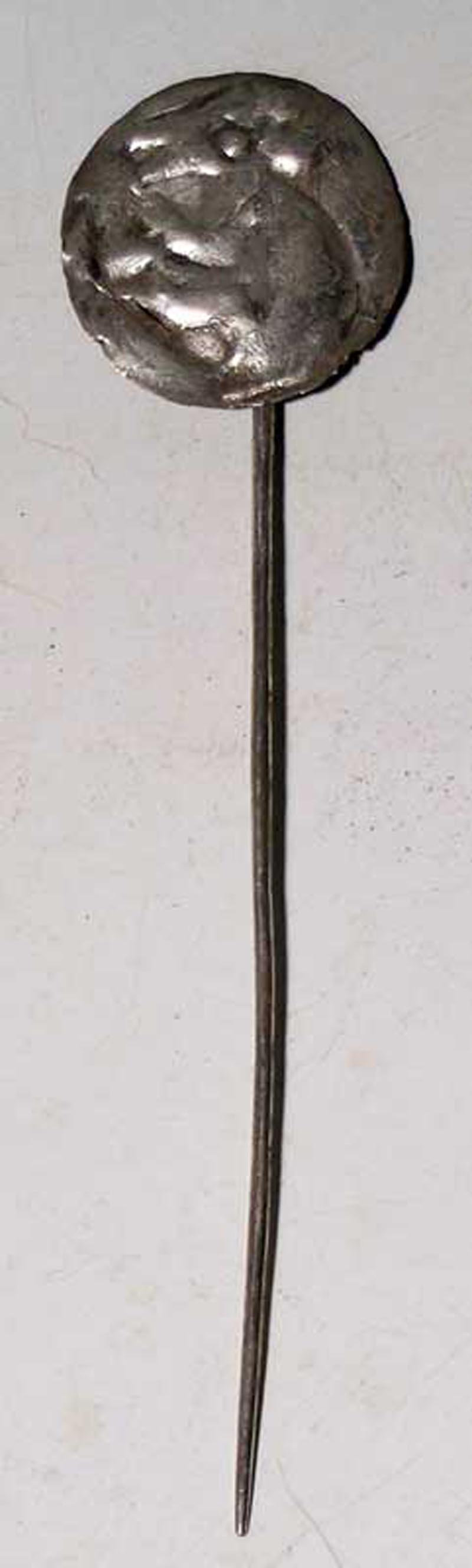 Chimu Silver Tupo from Peru, ca. 1100 - 1450 AD. An excellent Chimu silver tupo from Peru, ca. 1100 - 1450 AD. It is 5-1/4" long and is topped with a 1-1/4" diameter emblem depicting a coatimundi. Tupos were mantle pins signifying the elite status of the wearer. Great repousse workmanship. Ex Gallatin estate. Value range: $200 - $300.