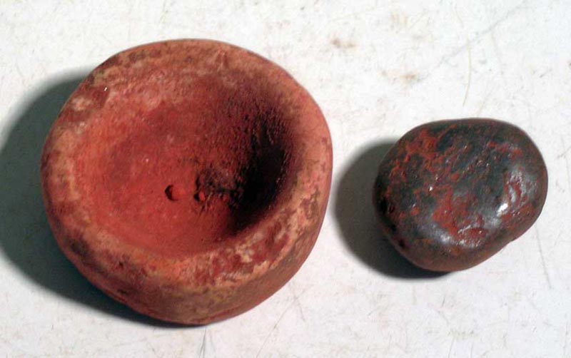 Chancay Stone Mortar from Peru, ca. 1100 - 1450 AD. A rare Chancay stone mortar and pestle from Peru, ca. 1100 - 1450 AD. It is 1-5/8" in diameter, carved from a white stone and was used to grind pigment, with much remaining red residue covering the stone. A flat, highly polished pebble was used as a pestle. Ex Zegarra collection. Value range: $150 - $200.