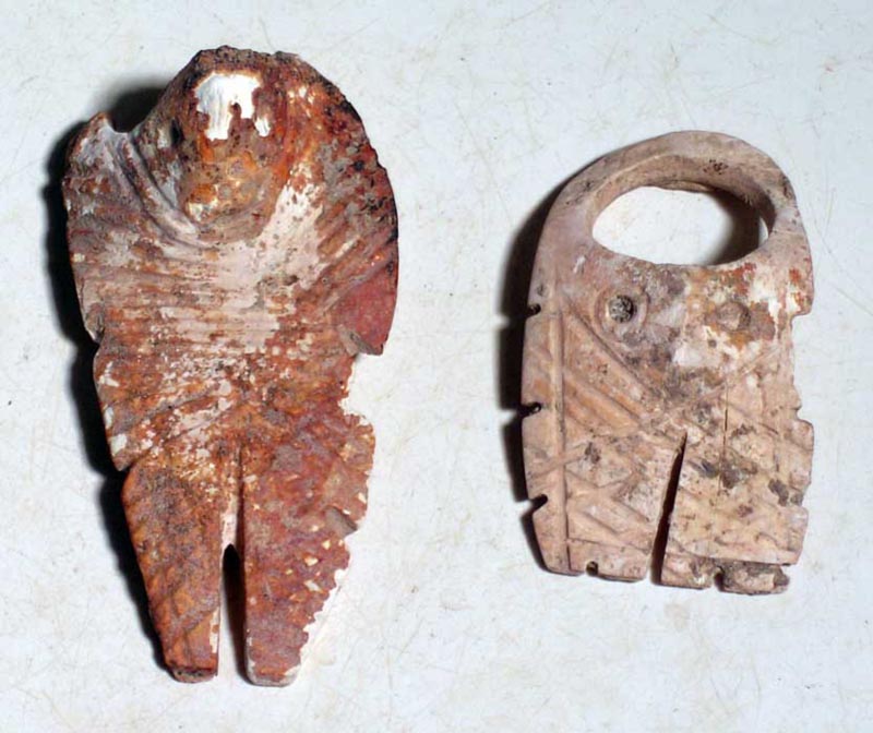 Maya Shell Ornaments from Guatemala, ca. 250 - 600 AD. A pair of rare Maya shell ornaments from Guatemala, ca. 250 - 600 AD. They are 2-1/2" and 1-3/4" long and are carved from white shell with zoomorphic features. Ex Foxworth estate. Value range $150 - $250.