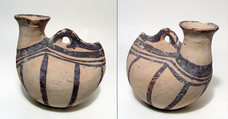 A Daunian Sub-Geometric Askos. A Daunian Sub-Geometric Askos, Italic, c. 550 - 500 BC, the rounded body with flattened base, tubular neck with flared moth, single handle with stubby tail behind it. H: 6 ï¾½" (16.5 cm); Dia: 7" (17.8 cm). Intact, few minor chips and light deposits. Ex Orange County private collection. Est Value $600 - $700.