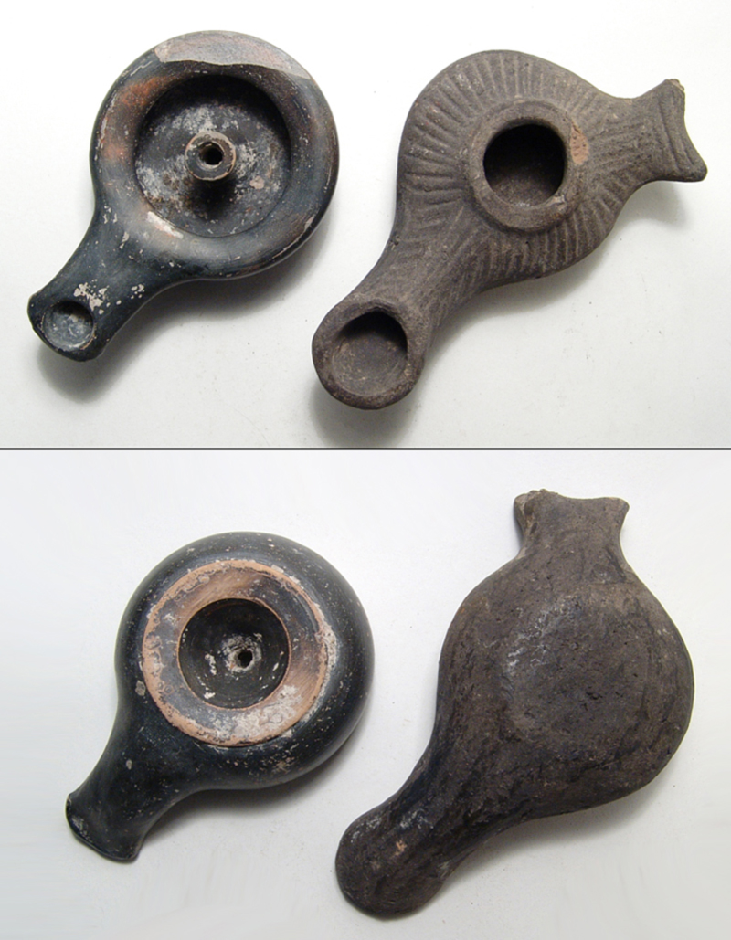 A pair of Greek Ceramic Lamps. Lot includes a Greek black-glazed lamp, c. 4th - 3rd Century BC, with central raised area with central hole for mounting on a lamp stand. L: 4" (10.8 cm). The second is a Hellenistic black-ware example with ribbed body and angled handle with crescent-shaped end. L: 5 ï¾¼" (13.4 cm). Both are nice examples! Ex Orange County private collection. Est Value $200 - $300.