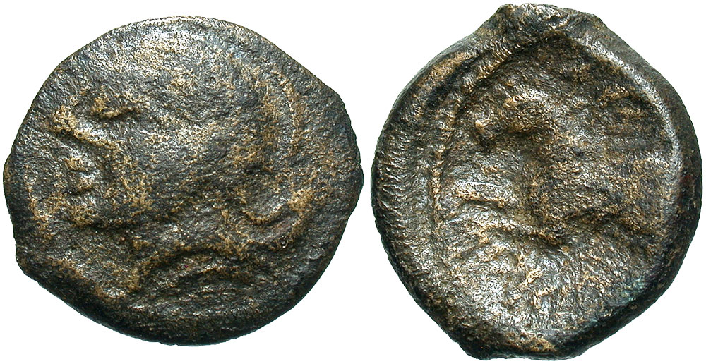 Northeast Gaul, Suessiones. 1st century B.C. Æ (16 mm, 2.40 g, 10 h). Helmeted head left / CRI[CIRV], pegasos leaping left. Delestrée & Tache 554; RIG 127; la Tour 7951. Fine, brown patina.