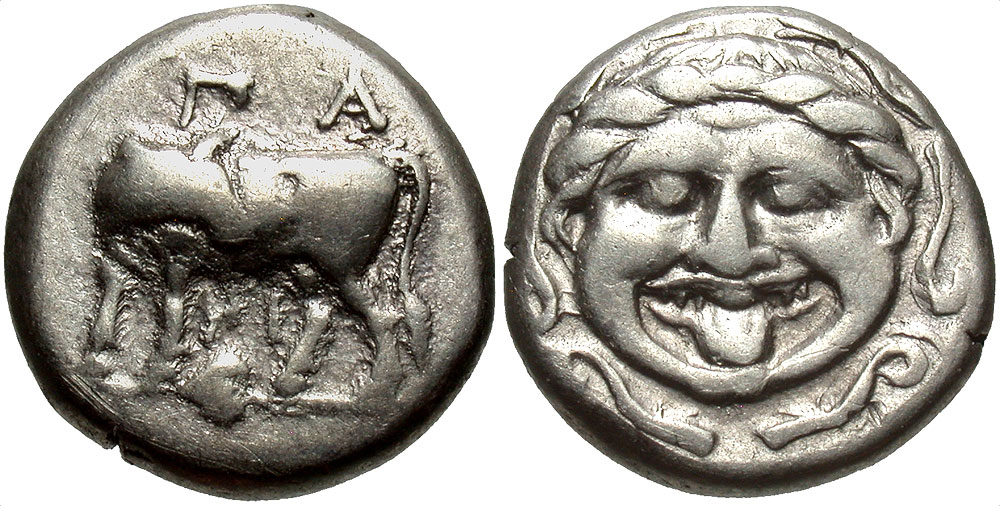 Mysia, Parion. 4th century B.C. AR hemidrachm (11 mm, 2.36 g, 8 h). ΠΑ/ΡΙ, bull standing left, head right; below, ivy leaf left / Gorgoneion. SNG BN -; SNG von Aulock 7426. VF, tight flan but well centered.