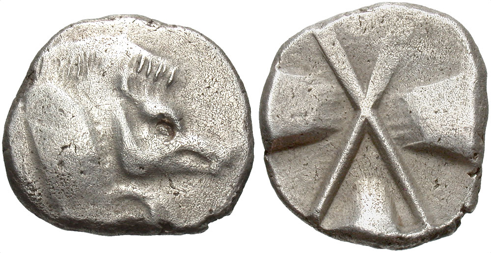 Lycian Dynasts. Uncertain ruler. Ca. 500-470/60 B.C. AR 1/3 stater (14 mm, 2.58 g). 1st proto-dynastic period. Rare variety. Forepart of boar right / Incuse square divided by large X, indentations on three sides. Cf. Falghera 20 (boar left); SNG Copenhagen Suppl. -; cf. SNG von Aulock 4051-2 (same). VF, apparently unpublished with boar to right.
