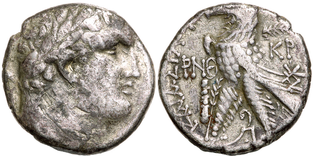 Phoenicia, Tyre. 126 B.C.-A.D. 65. AR shekel (24 mm, 13.40 g, 12 h). Dated CY 159 (A.D. 33/4). Crucifixion year. Laureate bust of Melkart right / [TYPIOY IEPAΣ] KAI AΣYΛOY, eagle standing left on prow, palm over far wing; date (PNΘ) above club to left, KP and monogram to right, Phoenician "b" between legs. Cf. Rouvier 2107 (monogram); RPC 4663; cf. BMC 204 (same). aVF, area of smoothed horn silver on obverse, date clear and sharp.