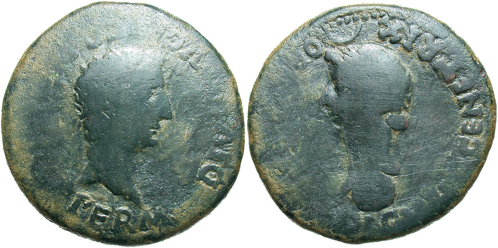 Lot 33-078. Hispania, Colonia Romula. Divus Augustus, with Livia. Died A.D. 14. Æ dupondius.