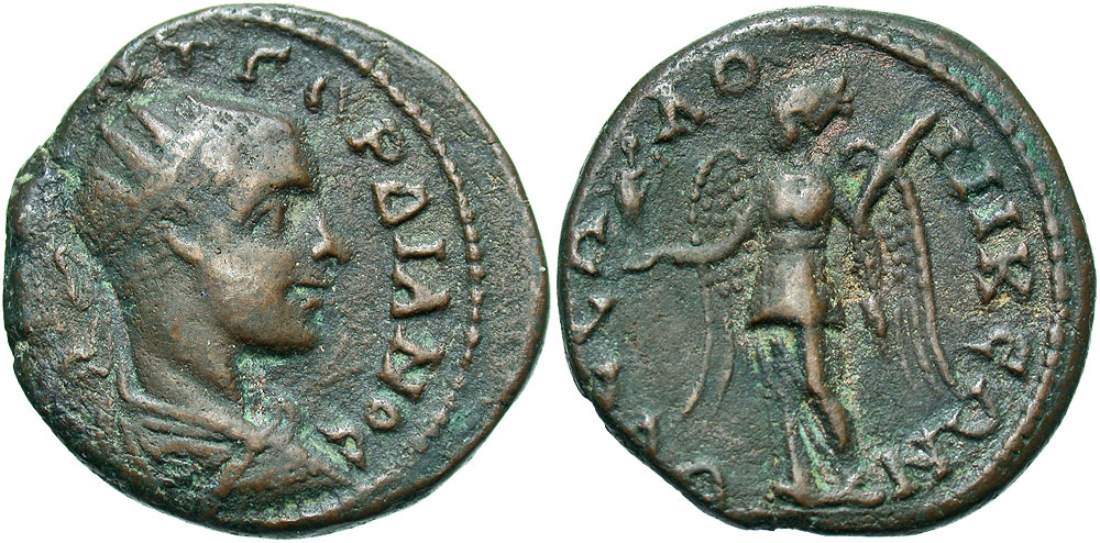 Macedon, Thessalonica. Gordian III. A.D. 238-244. Æ 23 (23 mm, 8.75 g, 8 h). Struck A.D. 238-240/1. [AV K M A]NT ΓOPΔIANOC, radiate, draped and cuirassed bust right / ΘЄCCA-ΛO-NIKЄΩN, Nike standing left, holding kabeiros and palm. Touratsoglou - but dies V3/R36; cf. SNG ANS 880 (laureate). VF, brown patina.