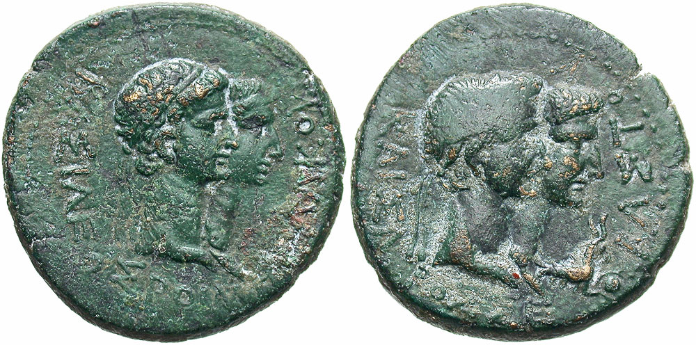 Thracian Kingdom. Rhoemetalkes I. Ca. 11 B.C.-A.D. 12 Æ 28 (28 mm, 13.51 g, 6 h). ΒΑΣΙΛΕΩΣ ΡΟΙΜΕΤΑΛΚΟΥ, diademed head of Rhoemetalces and draped bust of Pythadoris, conjoined right / ΚΑΙΣΑΡΟΣ ΣΕΒΑΣΤΟΣ, heads of Augustus, laureate, and Livia, conjoined right; to right, capricorn right, holding globe. RPC 1708; Youroukova 182-4. VF, green patina. Ex CNG E319, 207.