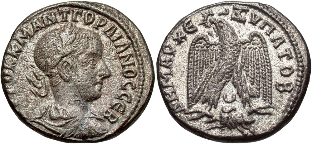 Syria, Seleucis and Pieria. Antiochia ad Orontem. Gordian III. A.D. 238-244. BI tetradrachm (25 mm, 10.95 g, 6 h). Struck A.D. 242. AVTOK K M ANT ΓOPΔIANOC CEB, laureate, draped, and cuirassed bust right / ΔHMAPX EΞOVCIA B, eagle standing facing, head left, holding wreath in beak, with wings spread; crescent over ram below. Prieur 295; McAlee 872. gVF, porosity.