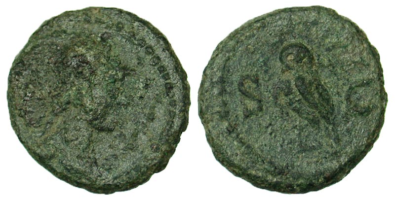 Anonymous. Domitian to Antoninus Pius. Æ quadrans (14.9 mm, 2.51 g, 5 h). Rome, A.D. 81-161. Helmeted and draped bust of Minerva right / S-C, Owl standing right, head facing. RIC 7. Fine.