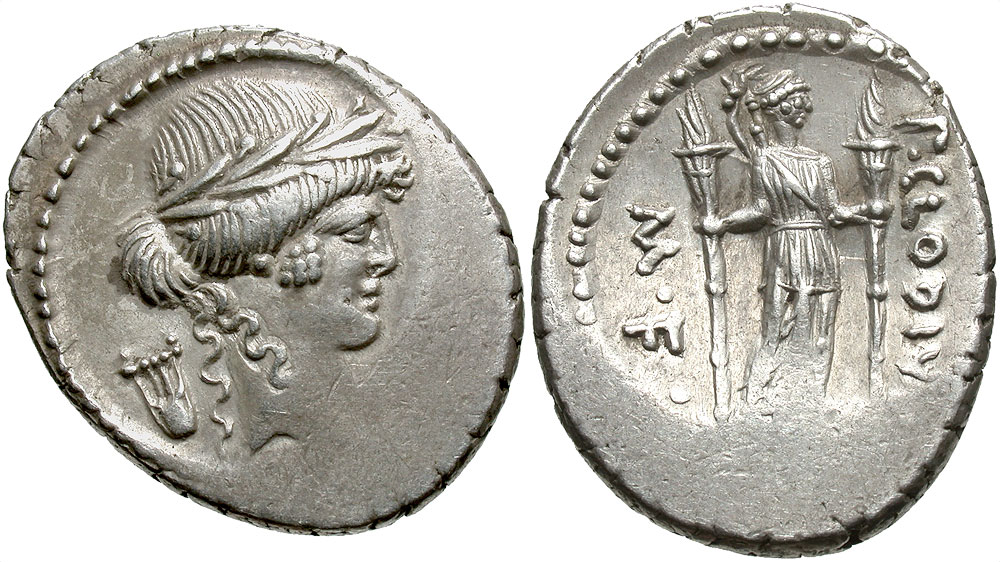 P. Clodius M.f. Turrinus. 42 B.C. AR denarius (18 mm, 4.07 g, 2 h). Rome mint. Laureate head of Apollo right; lyre behind / P · CLODIVS M · F ·, Diana Lucifera standing right, holding two long torches. Crawford 494/23; CRI 184; Sydenham 1117; RSC Clodia 15. gVF.