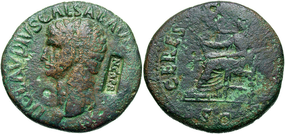 Claudius. A.D. 41-54. Æ dupondiius (29 mm, 14.92 g, 6 h). Rome mint, Struck A.D. 41/2. TI CLAVDIVS CAESAR AVG P M TR P IMP, bare head left; c/m: NCAPR in rectangular incuse behind / CERES [AVGVSTA], S C in exergue, Ceres seated left, holding grain-ears and long torch. RIC 94; BMC 136; for c/m: Pangerl 60. gFine, brown and green patina. Nice countermark.