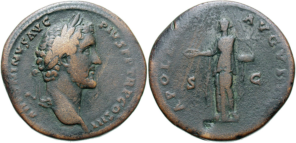 Antoninus Pius. A.D. 138-161. Æ sestertius (33 mm, 26.08 g, 12 h). Rome mint, Struck A.D. 141-143. ANTONINVS AVG PIVS P P TR P COS III, laureate head right / APOLL[INI] AVGVST[O], S C across field, Apollo standing facing, head left, holding patera and lyre. RIC 598; BMC 1229; Cohen 62. Fine, brown patina.