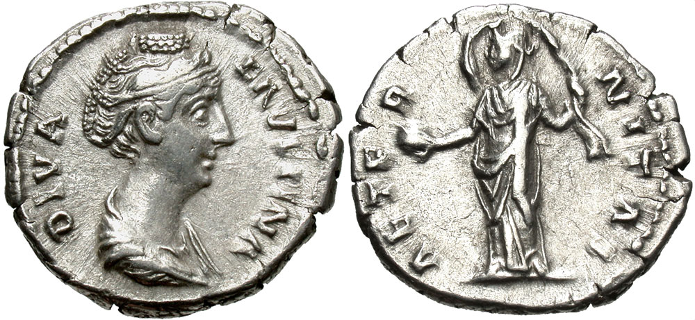 Lot 33-147. Diva Faustina I. Died A.D. 140/1. AR denarius. Rome mint, Struck under Antoninus Pius, A.D. 146/7-161.