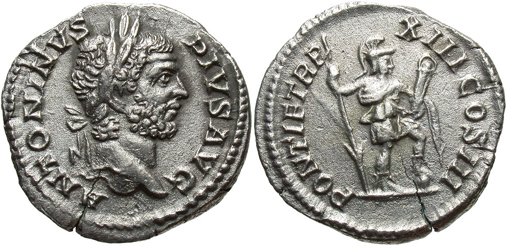 Caracalla. A.D. 198-217. AR denarius (18 mm, 1.79 g, 12 h). Rome mint, Struck A.D. 210. ANTONINVS PIVS AVG, laureate head right / PONTIF TR P XIII COS III, Virtus standing right, resting foot on helmet, holding spear and parazonium. RIC 117a; BMC 32-3; RSC 477. Good VF, porous, flan crack.