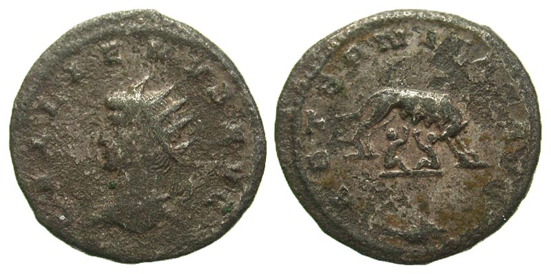 Gallienus. A.D. 253-268. Æ antoninianus (21.3 mm, 3.28 g, 11 h). Antioch, A.D. 265-266. GALLIENVS AVG, radiate head left / AETERNITAS AVG, Romulus and Remus suckling from a she-wolf, branch below. Göbl 1628a; RIC 628 var (head right). toned aVF, rough surfaces, silvered. Rare. .