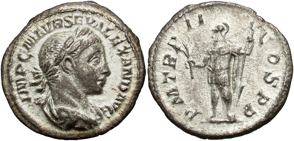 Severus Alexander. A.D. 222-235. AR denarius (19 mm, 2.27 g, 1 h). Rome mint, Struck A.D. 223. IMP C M AVR SEV ALEXAND AVG, laureate, draped and cuirassed bust right / P M TR P II COS P P, Mars standing left, holding olive branch and spear. RIC 23; RSC 231. VF, light porosity.