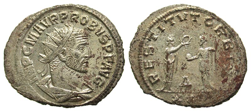 Probus. A.D. 276-282. AR antoninianus (23.0 mm, 3.75 g, 11 h). Antioch, A.D. 280. IMP C M AVR PROVBS P F AVG, radiate, draped and cuirassed bust right / RESTITVT ORBIS, female personification of Orbis Terrarum standing, facing right, holding wreath; emperor standing, facing left, holding globe and scepter; A between, XXI in exergue. RIC 925. VF, fully silvered.