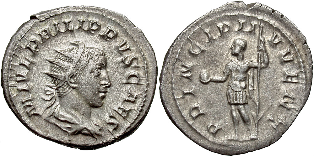 Philip II. As Caesar, A.D. 244-247. AR antoninianus (23 mm, 3.78 g, 2 h). Rome mint, Struck under Philip I, A.D. 246. M IVL PHILIPPVS CAES, radiate, draped and cuirassed bust right / PRINCIPI I-VVENT, Philip II standing left, holding globe and reversed spear. RIC 218d; RSC 48. gVF, minor porosity.