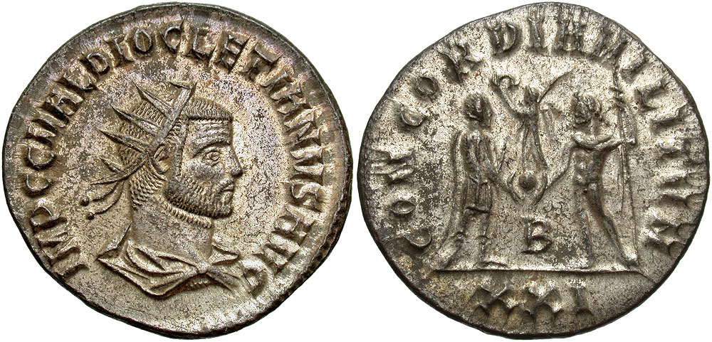 Diocletian. A.D. 284-305. Æ antoninianus (21 mm, 3.50 g, 5 h). Cyzicus mint, Struck A.D. 295-296. IMP C C VAL DIOCLETIANVS AVG, radiate, draped and cuirassed bust right / CONCORDIA MILITVM, emperor standing right, holding parazonium, receiving Victory on globe from Jupiter standing left, holding scepter; B//XXI. RIC 306. EF, fully silvered.