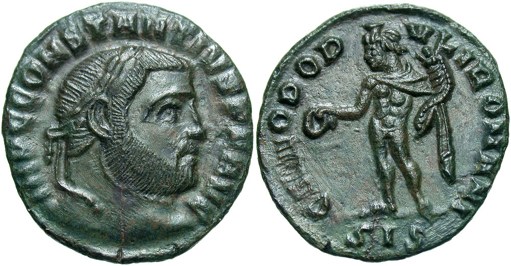 Lot 33-184. Constantius I. A.D. 305-306. Æ quarter follis. Siscia mint, Struck A.D. 305. Scarce. As Augustus.