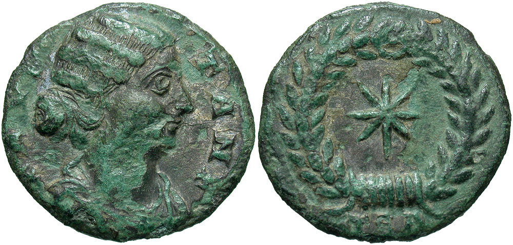 Fausta. Augusta, A.D. 324-326. Æ follis (17 mm, 1.99 g, 12 h). Thessalonica mint, Struck A.D 318-319. FAVSTA NF, draped bust right, wearing a pearl necklace / star of eight rays within laurel within wreath; TSA. RIC 49; LRBC 825. VF, green patina, roughness.