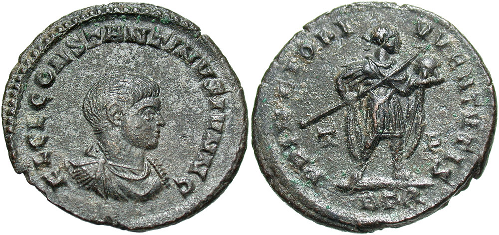 Constantine II. As Caesar, A.D. 317-337. Æ follis (20 mm, 3.21 g, 12 h). Treveri mint, Struck A.D. 317. FL CL CONSTANTINVS IVN N C, bare-headed, draped and cuirassed bust right / PRINCIPI IVVENTVTIS, Constantine in military dress standing right, holding globe and spear, F-T//BTR. RIC 173. aEF, dark green patina, minor porosity.