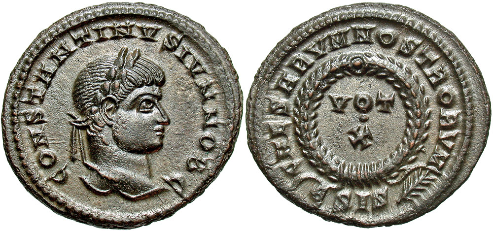 Constantine II. As Caesar, A.D. 317-337. Æ follis (20 mm, 3.73 g, 1 h). Siscia mint, Struck A.D. 321-324. CONSTANTINVS IVN NOB C, laureate head right / CAESARVM NOSTRORVM around VOT X in two lines within wreath; ЄSIS(branch). RIC 176. gVF, green-brown patina.