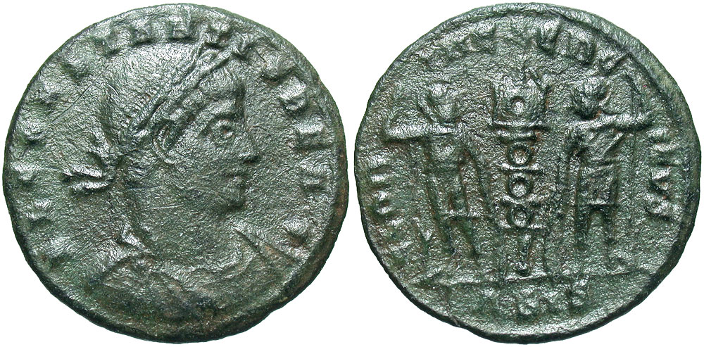 Constans. As Caesar, A.D. 333-337. Æ 3/4 (16 mm, 1.37 g, 12 h). Siscia mint, Struck A.D. 335-336. Scarce legend variation. F L CONSTANTIS BEA C, laureate and cuirassed bust right / GLORIA EXERCITVS, two soldiers, holding spears and shields, standing facing, one standard between them; ASIS. RIC 255; LRBC 757. aVF, green patina.