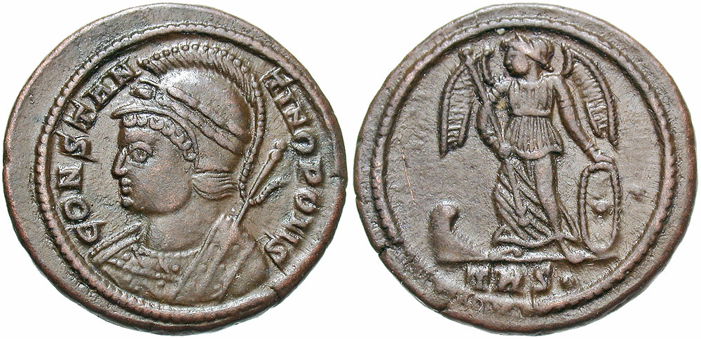 City Commemorative. A.D. 330-354. Æ follis (18 mm, 3.15 g, 12 h). Treveri mint, Struck under Constantine I, A.D. 330/1. CONSTAN-TINOPOLIS, laureate and helmeted bust of Constantinopolis left, wearing imperial mantle, scepter over shoulder / Victory standing left, right foot on prow, holding scepter and shield; TRS·. RIC 530. Good VF, brown patina. An attractive example.