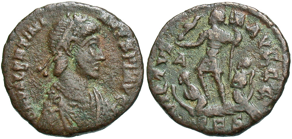 Lot 33-201. Valentinian II. A.D. 375-392. Æ 3. Thessalonica mint, Struck A.D. 389-392. Rare issue.