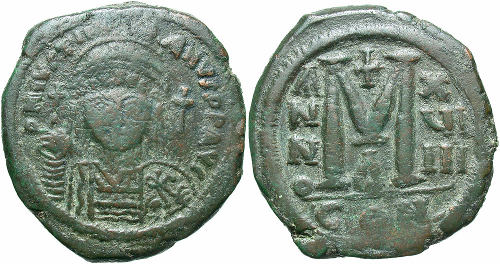 Lot 33-207. Justinian I. 527-565. Æ follis. Constantinople mint, Dated RY 19 (545/6).