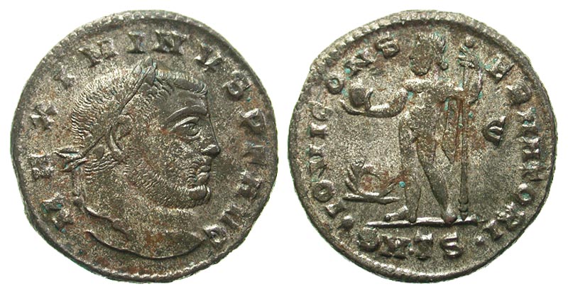 Maximinus II Daza. A.D. 309-313. Æ Follis (22.9 mm, 2.44 g, 0 h). Thessalonica, A.D. 312. MAXIMINVS P F AVG, laureate head right / IOVI CONSERVATORI, Jupiter standing facing, head left, chlamys draped from shoulder, holding globe and scepter; wreath-Є in fields; ·SM·TS· in exergue. RIC 50a. VF, silvered.