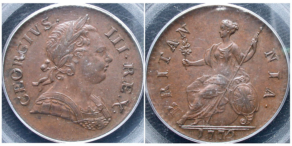Lot 33-251. England. George III. 1772. Æ halfpenny. Incuse hair-coil variety. Tower mint (London).