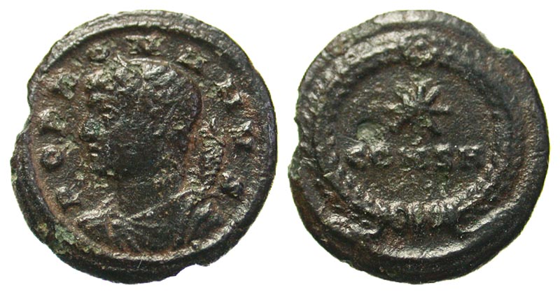 Constantine I. A.D. 307/10-337. Æ 4 (14.4 mm, 0.99 g, 11 h). Constantinople, ca. A.D. 330. POP ROMANVS, draped bust of Genius Romanii facing left, cornucopia over shoulder / Wreath around, star over CONSH. RIC 22; LRBC 1067. aVF, Rare.