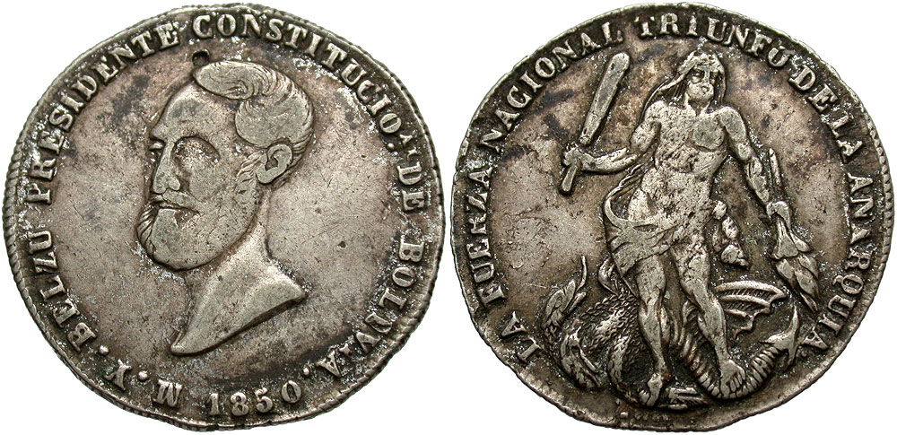 Bolivia, Republic. 1850. 4 sueldos (31 mm, 13.46 g). Potosi mint. Dies by Mulon. Fonrobert 9552; Burnett 31A. VF, toned, small puncture mark on obverse.