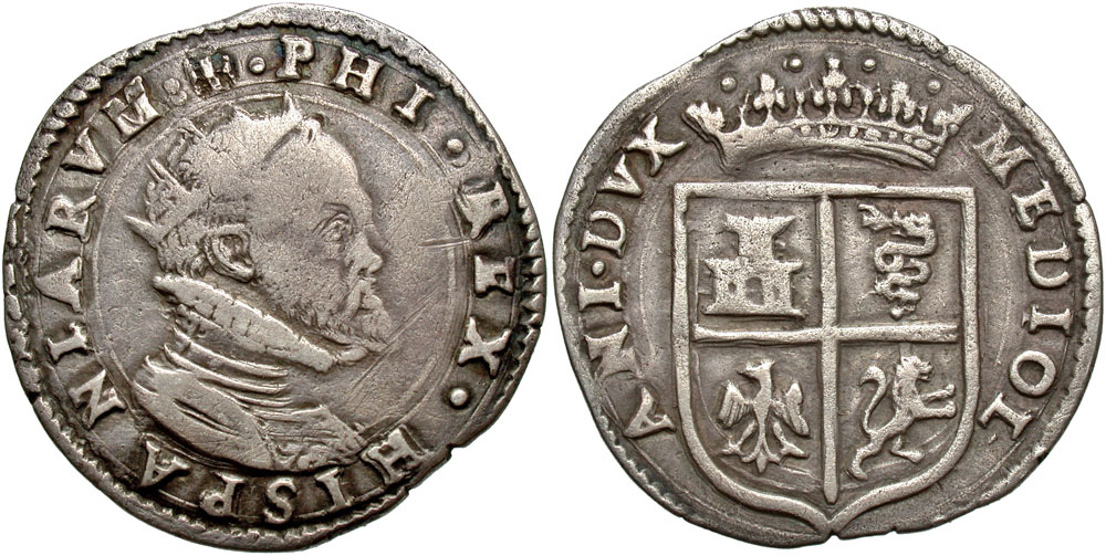 Italian States, Milan. Filippo II of Spain. 1554-1598. AR 1/4 scudo (29 mm, 7.70 g). Very rare. Crowned and armored high-collared bust to right / Crowned shield of four-fold arms. KM 148. Good Fine, toned.